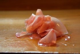 一貫食べたら,ショウガを食べてからお茶で舌の脂を流し,次の握りを頂きます。