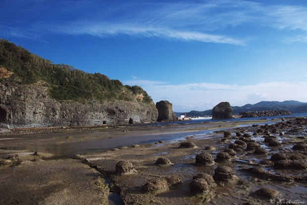 化石や海蝕崖なども見られる奇異な地形の平たい岩場です。