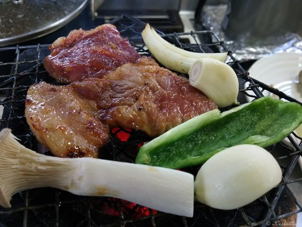 昨日は、唐戸市場で寿司@魚をタラフク食ったので(日記は後程)今日のランチは肉?。 焼肉です。 安い肉ですが、豚肩ロースを塊から切り出し、牛もステーキ肉を焼肉カット。 炭火だと超美味です。