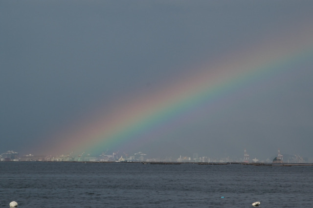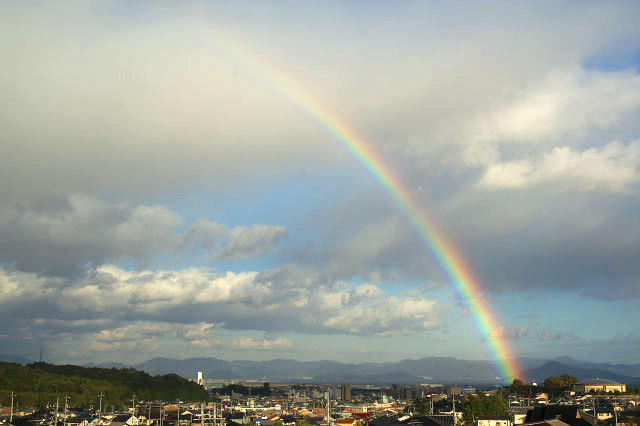 綺麗な半円の虹はなかなか見られません。自宅近くで見ることができました。でも、写真には完全に撮影できず。魚眼に近い広角レンズが必要です。
