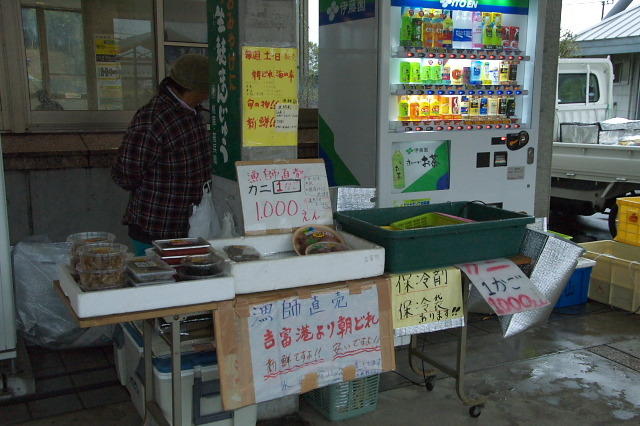 07:30 目を覚ますと本降りの雨。昨夜はほとんど雨に降られる事無くドライブできて楽だった。昼頃には雨はあがると予測。雨が上がりそうになるまで、ゆっくりすることにした。居眠りしたり、道の駅の市場に買い物に行ったりのんびり過ごす。お昼の弁当と夜のつまみ用に「活きわたり蟹」を入手♪