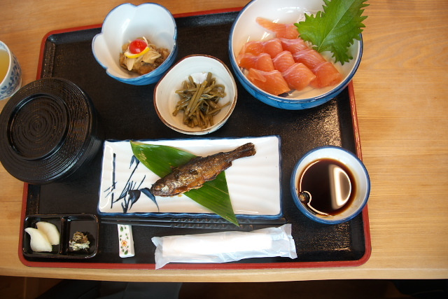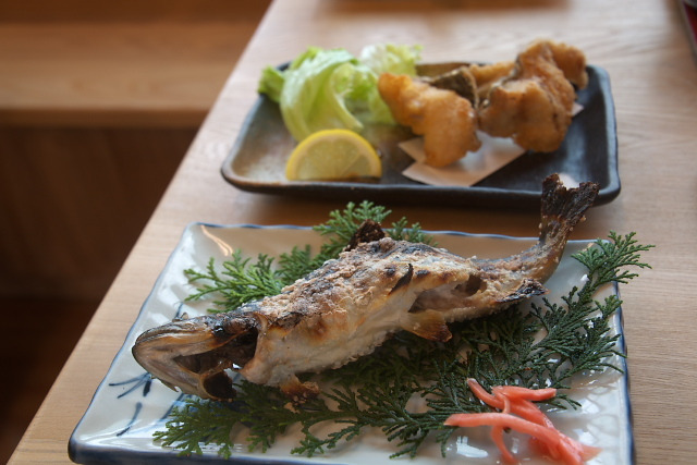 塩焼きは,岩魚が普通サイズ一匹。虹鱒は大サイズ一匹。
