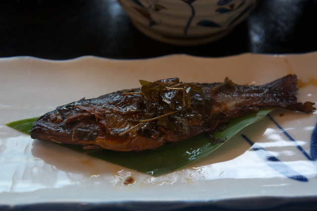 甘露煮。小鉢(とうふ)(南蛮漬け)(葉わさび?)