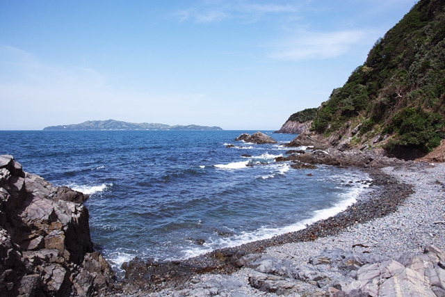 最初に撮影できたのは「犬!」・・・というなんともテンションだだ下がりな状態。一縷の期待を持って,白浜港へ向かう事にしました。地図では海岸線沿いに道路と,中央を縦貫する形の「つばきロード=健脚向き」の記載がありました。海岸沿いに歩いて行くと今度は目の前に広がる絶壁と岩場。涙がでそう。