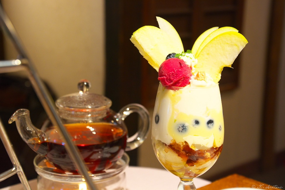 14品とお茶・・・追加で青りんごとブルーベリーのパフェ