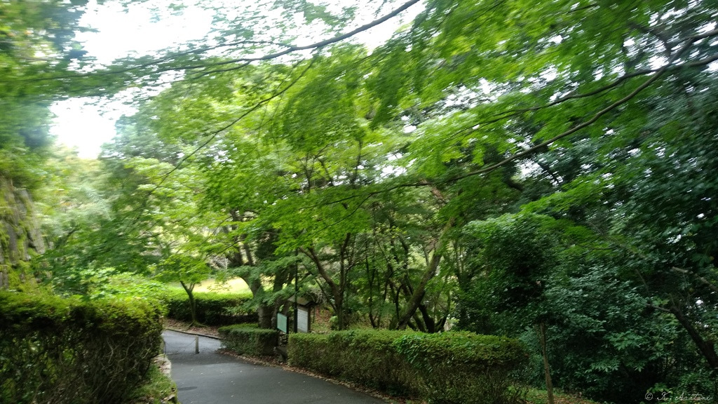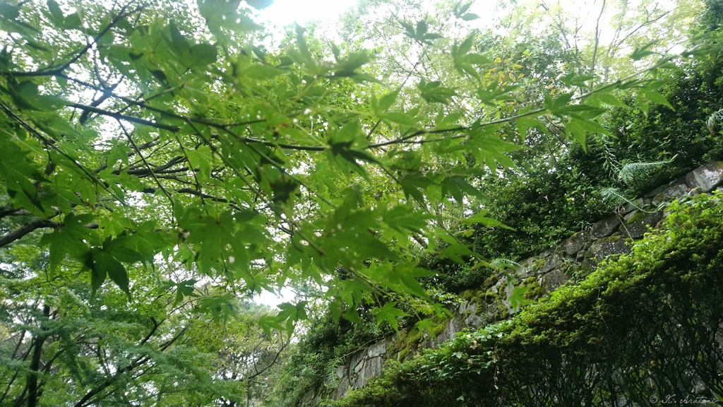 桜の時期には時々写真を撮りに来る亀居公園。紅葉前のもみじの緑が雨に濡れて綺麗だった。