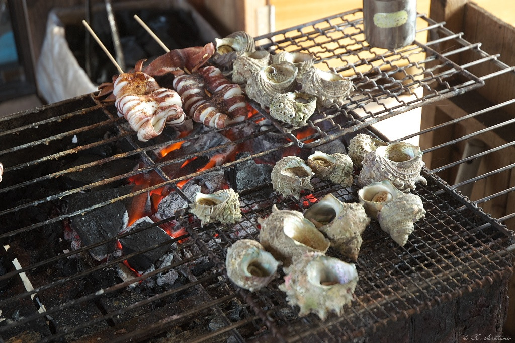 次は2008年の6月初め。十種ヶ峰登山の後に須佐のフォルンフェルスに寄ったら,サザエの出店が出ていて,店じまいの時間近いのにたくさん売れ残っているので,10個1000円の所を2個サービスしてくれて12個。3人のメンバーで一人4個ずつ食べました。その時の事を,角島の食いつくしツアーの司令官に伝えたんだと思います。「次のキャンプの時には必ずサザエを準備せよ」との指令。