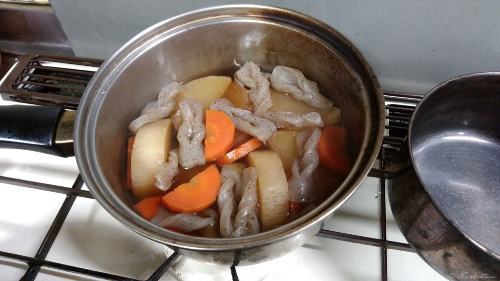 野菜室の中にあった大根と人参,(普通のw)こんにゃくで,おでん風の煮もの。