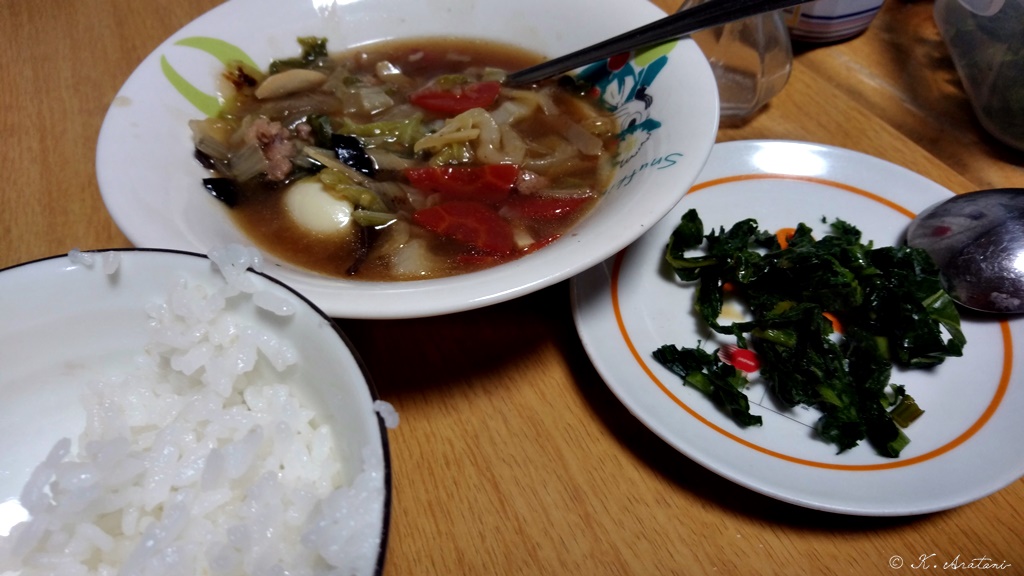 朝ごはんは,中華丼とインスタント味噌汁。朝からWordPressの修復に備えて,データをローカルにバックアップ中。10数万のファイル数なので,2日目ですがまだ半分もDLできていません。